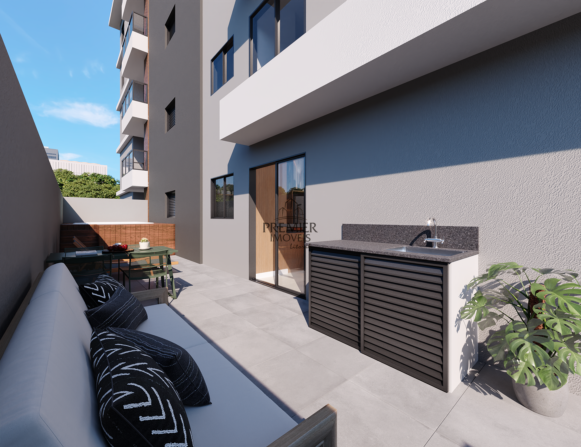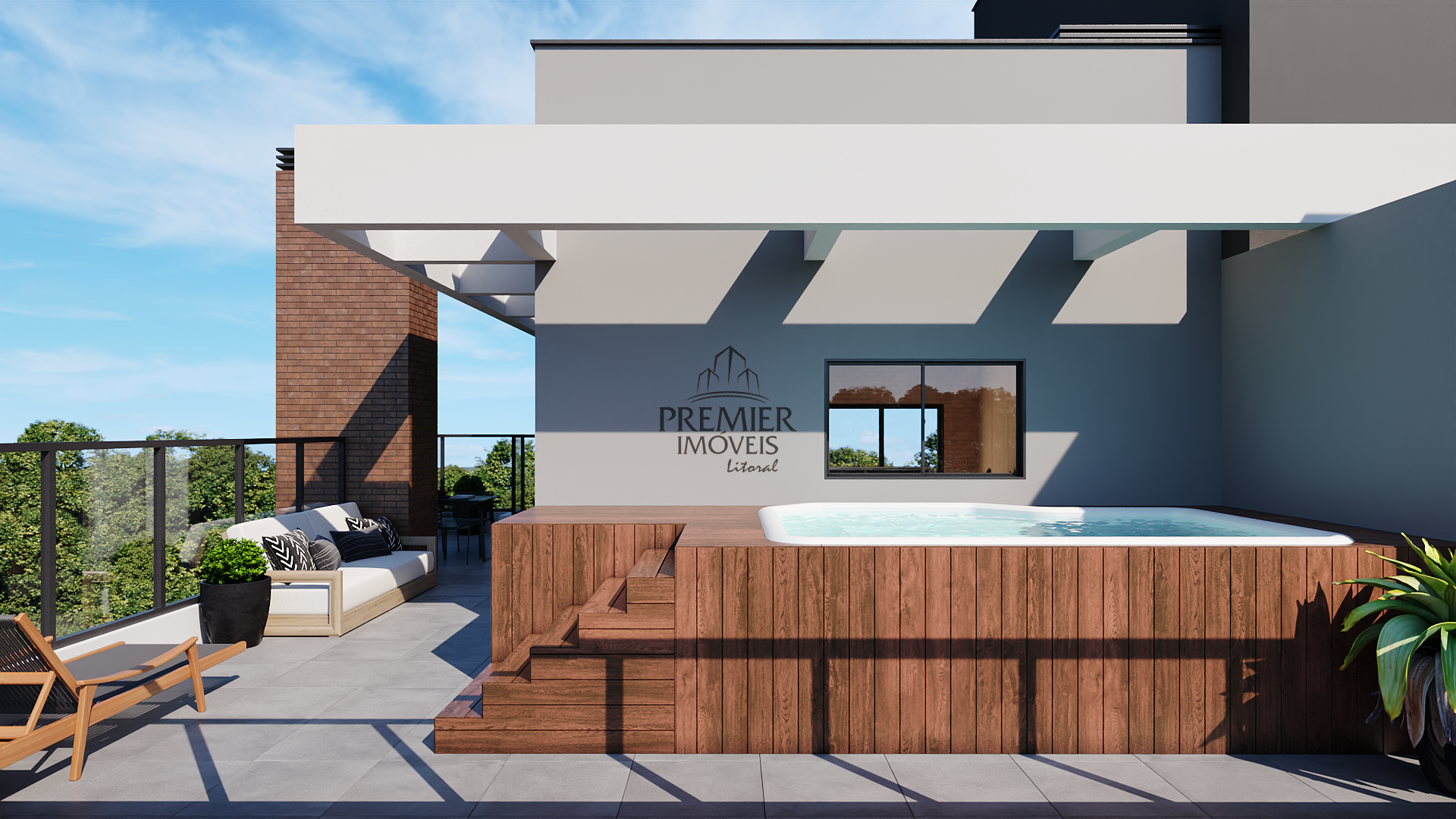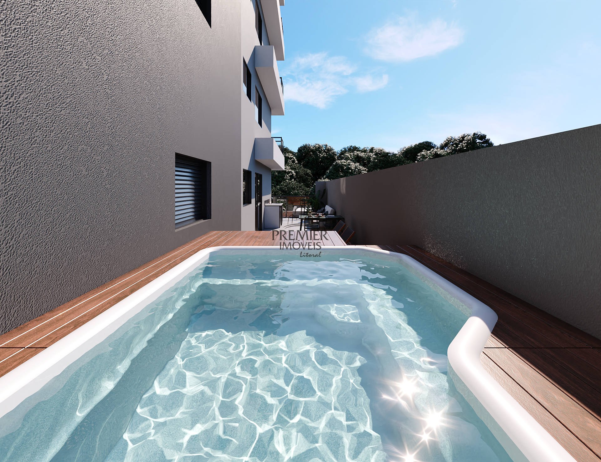 * Garden com piscina e churrasqueira.