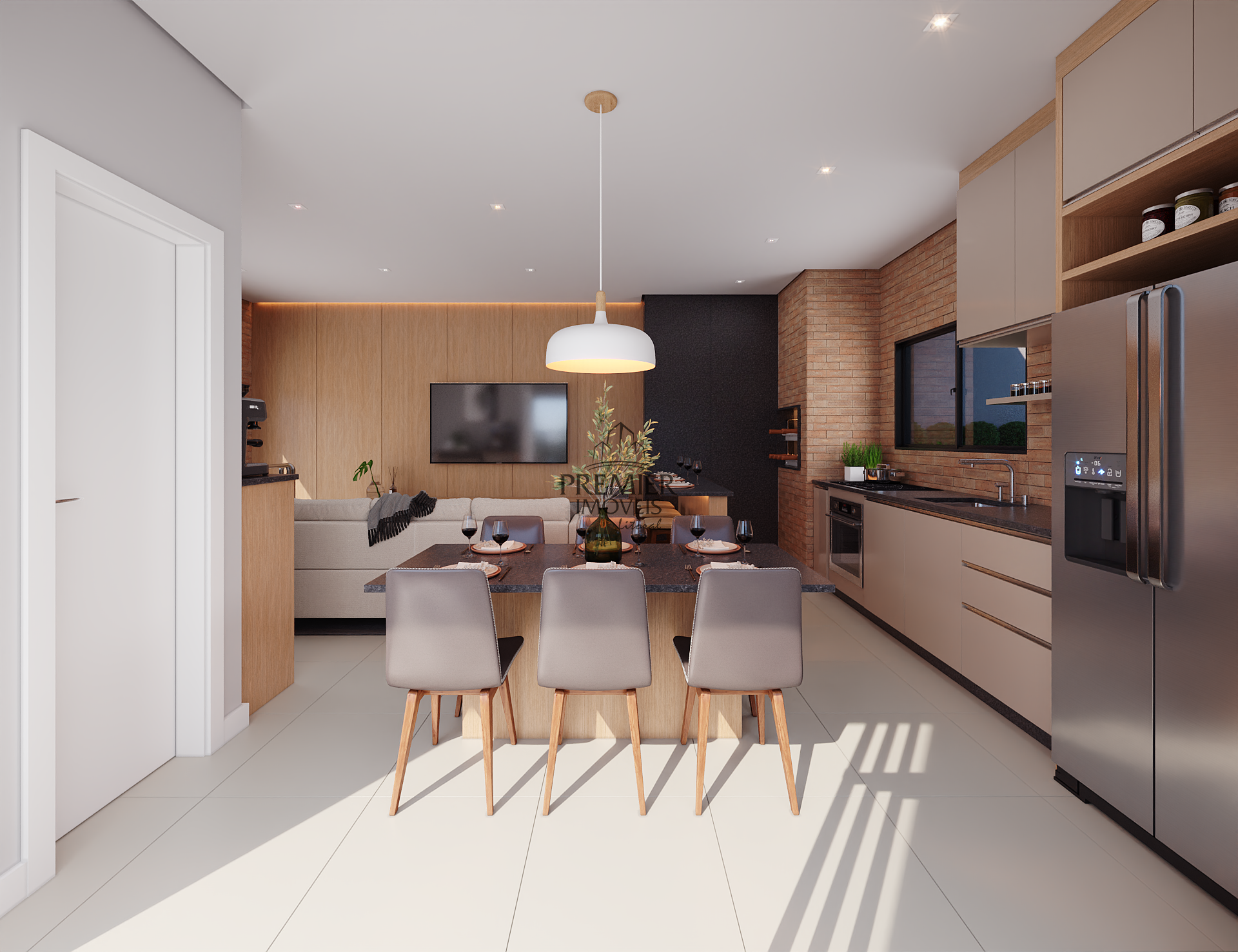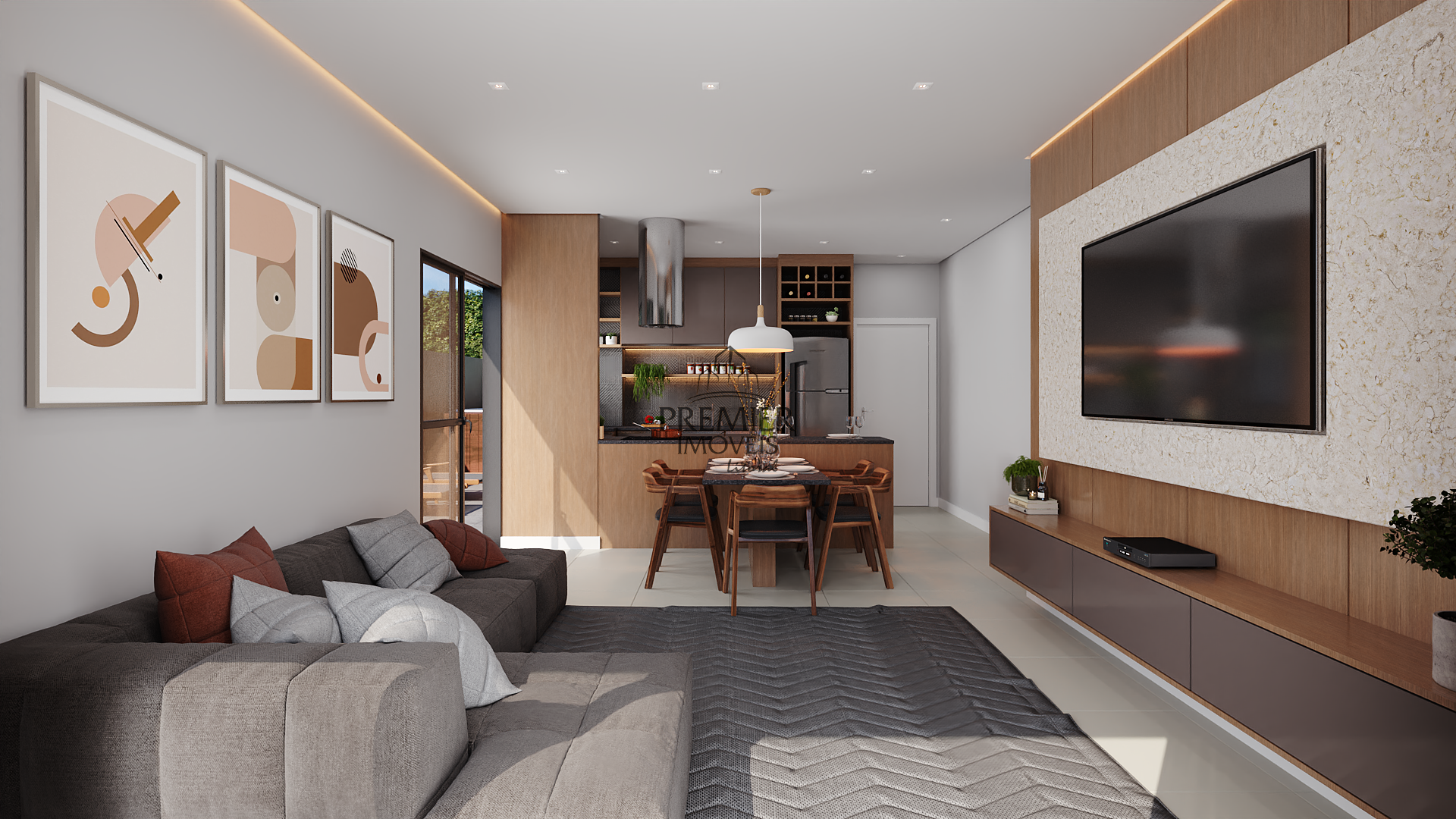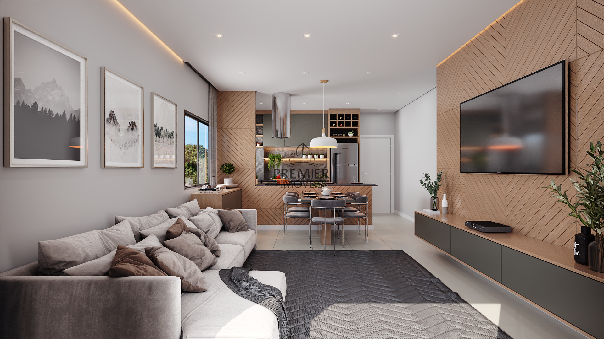 * Sala de estar/ Jantar e cozinha em conceito aberto.