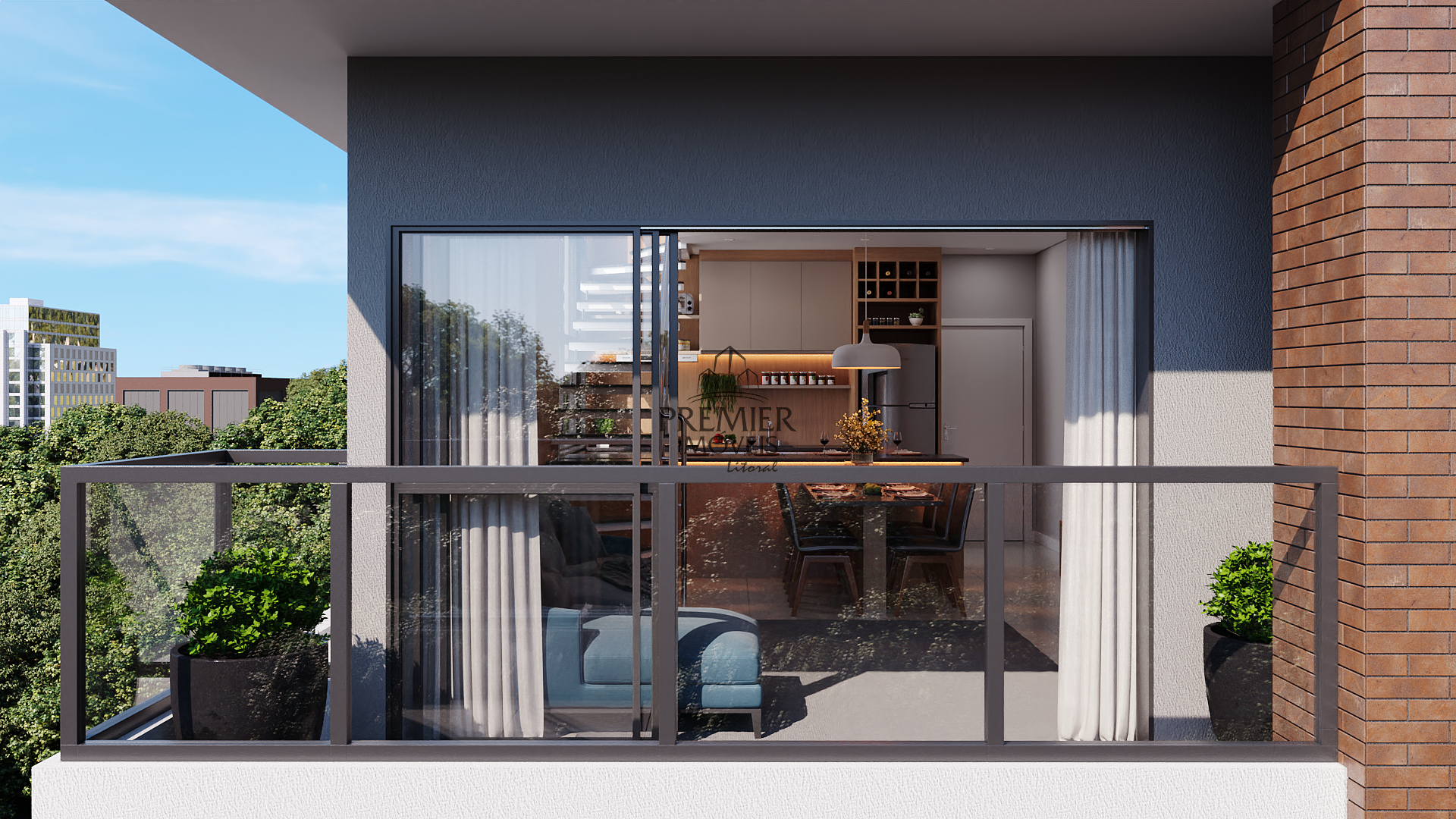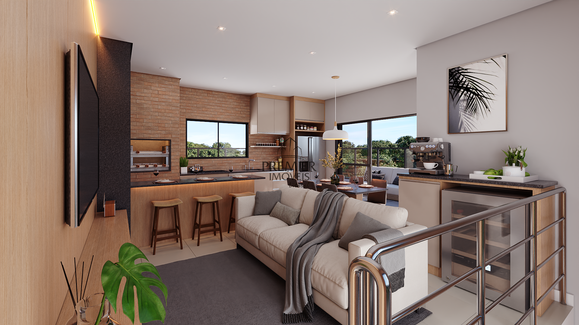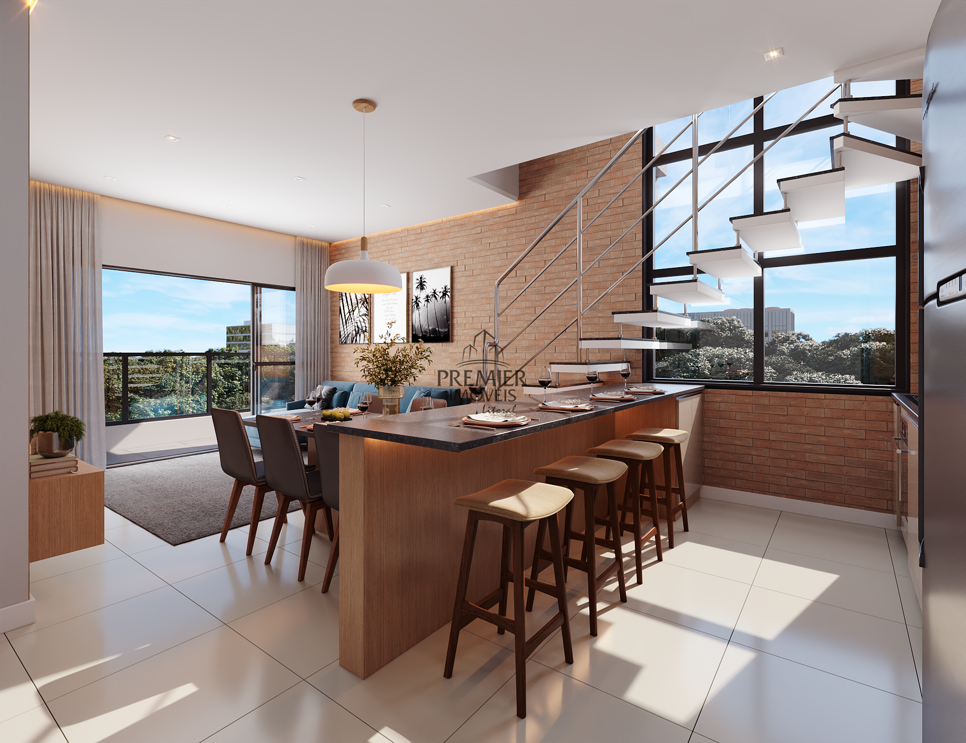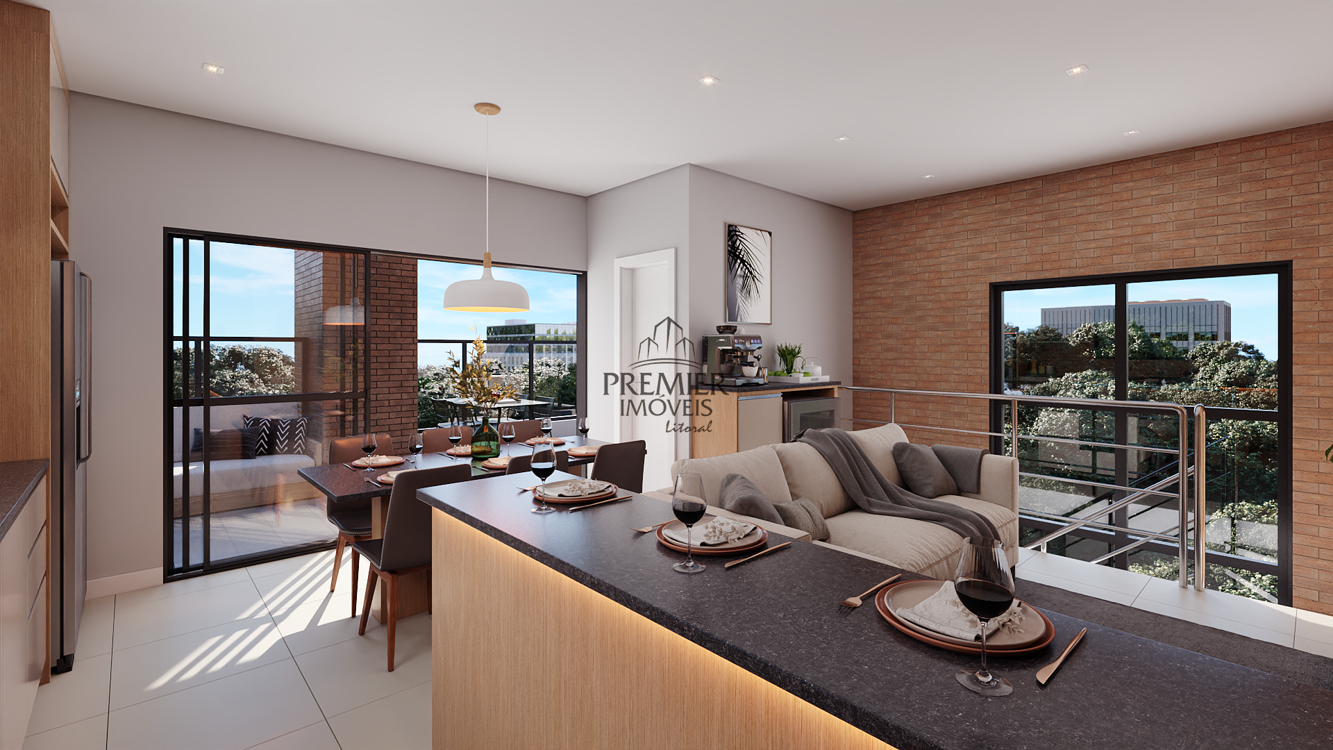 * Sala de estar com sacada / Jantar e cozinha em conceito aberto.